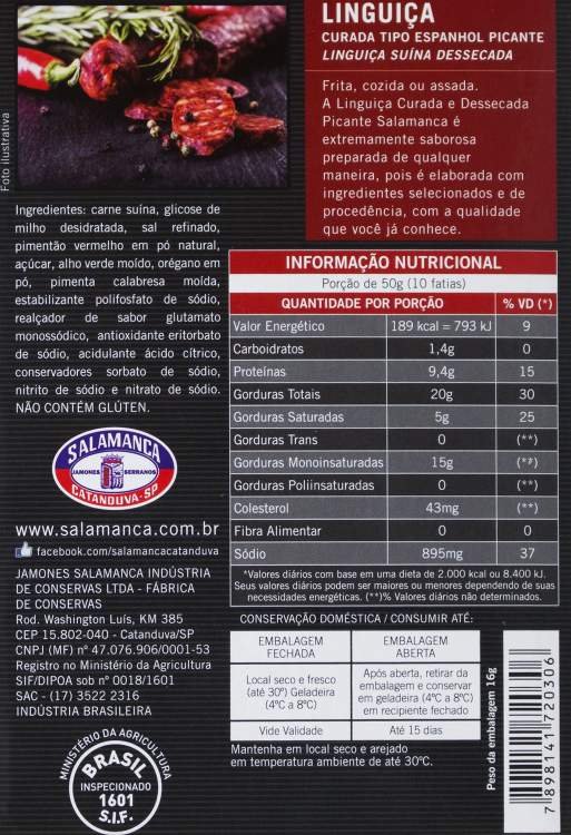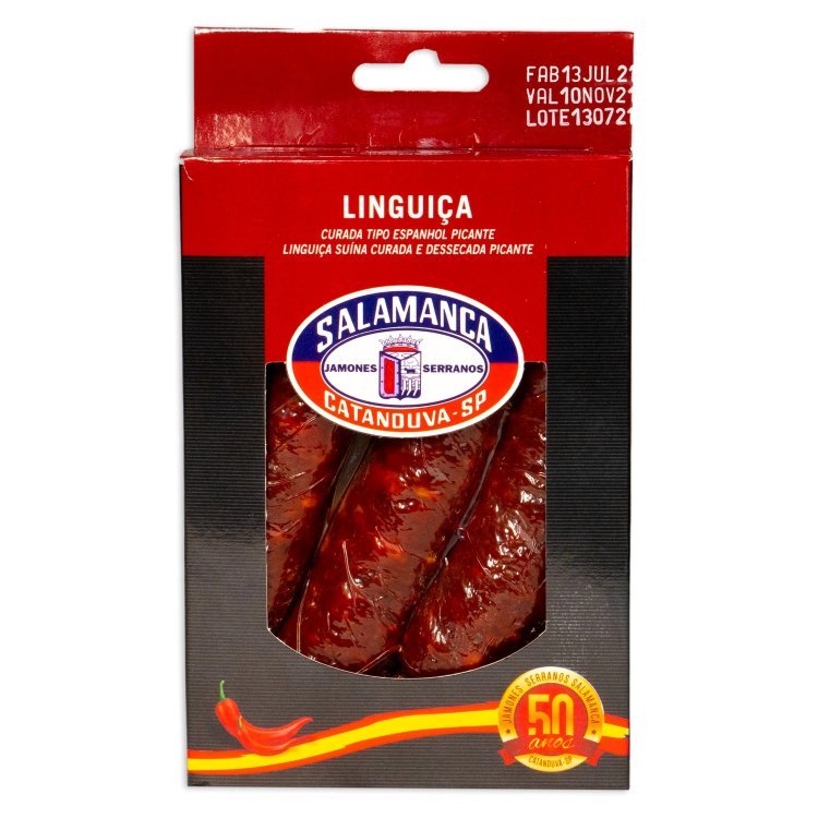 Ingredientes:Carne suína selecionada, gordura, sal, especiarias como páprica e pimenta calabresa