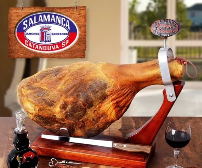 Suporte para Presunto Jamon Serrano em Madeira Premium – Salamanca Suporte para presunto e jamon de madeira e aço, usado para manter o presunto de forma estável e segura, permitindo fatiá-lo com mais facilidade e precisão. É essencial para aproveitar todo o sabor e a textura do presunto, pois a peça é firmemente presa e pode ser girada ou inclinada para acessar todas as áreas de carne. O suporte oferece uma base sólida para fixar a peça de presunto, evitando que ela se mova durante o corte. Facilidade de fatiar: Ao manter o presunto na posição correta, o suporte facilita o manuseio da faca, resultando em fatias finas e uniformes. Ajuste e rotação: Muitos suportes possuem um anel ou sistema de fixação que permite girar a peça, facilitando o acesso a todas as partes do presunto. Materiais: Madeira e aço inoxidável O suporte para presunto e jamon é um acessório que proporciona o ângulo e a fixação ideais para cortar presuntos inteiros, como o presunto cru de Parma ou Serrano, em fatias finas e com o máximo aproveitamento da carne 1 Unidade de aprox. 2,3kg de peso